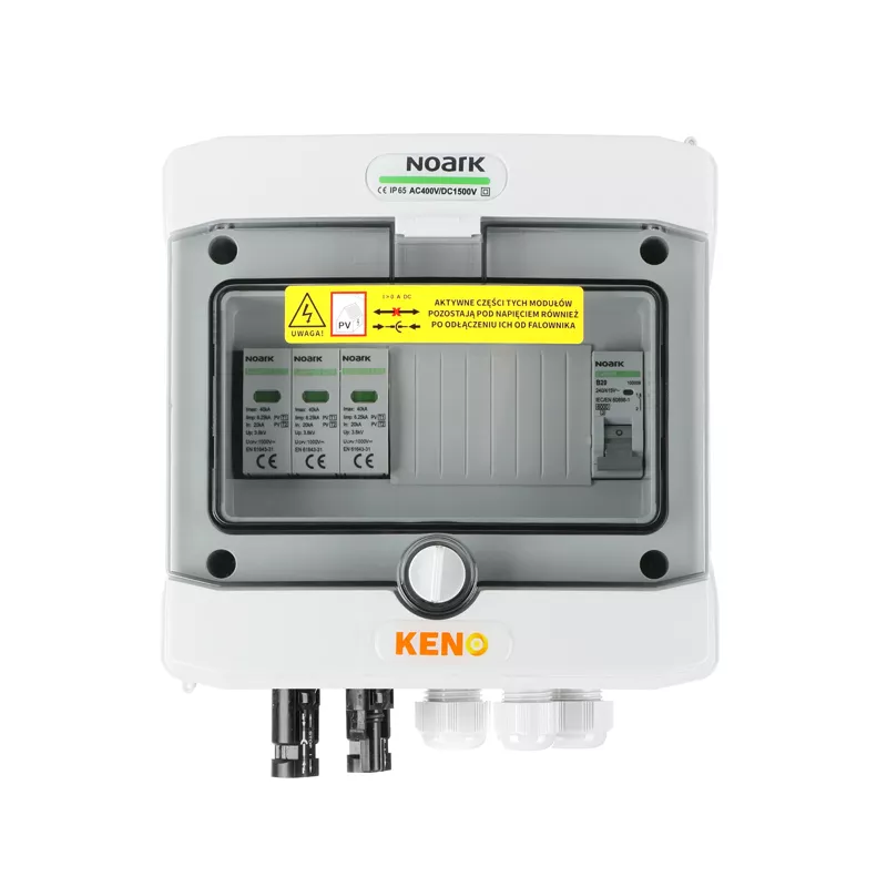 Rozdzielnica przyłączeniowa DC+AC z ogranicznikiem przepięć Noark 1000V typu 1+2, 1 x łańcuch PV, 1 x MPPT // 20A, 1-F