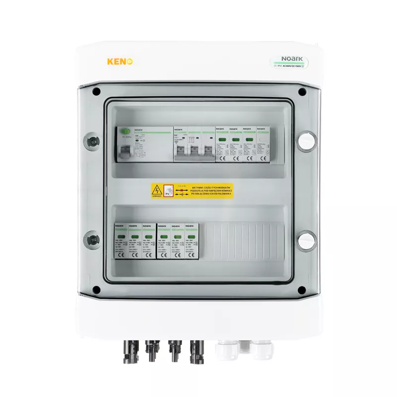 Rozdzielnica przyłączeniowa DC+AC z ogranicznikiem przepięć Noark 1000V typu 1+2, 2 x łańcuch PV, 2 x MPPT // ogr. AC Noark typ 1+2, 20A 3-F, róż. 100mA 40A