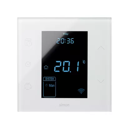 Simon 100 W100-10000810x-130 Termostat iO z czujnikiem wewnętrzym 10A, 127-230V, zaciski śrubowe. !Wersja kompletna - monoblock do puszki 1-krotnej; biały
