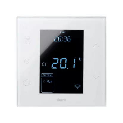Simon 100 W100-10000811x-130 Termostat iO z czujnikiem zewnętrzym (sondą) 10A, 127-230V, zaciski śrubowe. !Wersja kompletna - monoblock do puszki 1-krotnej; biały