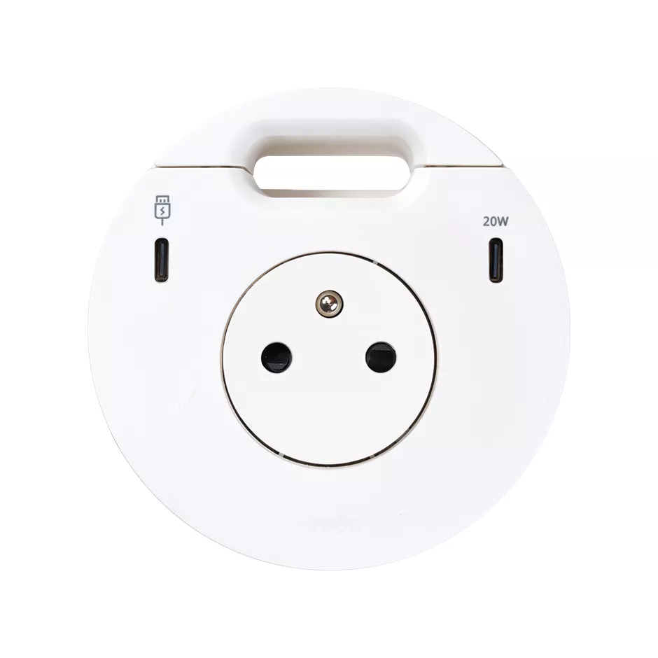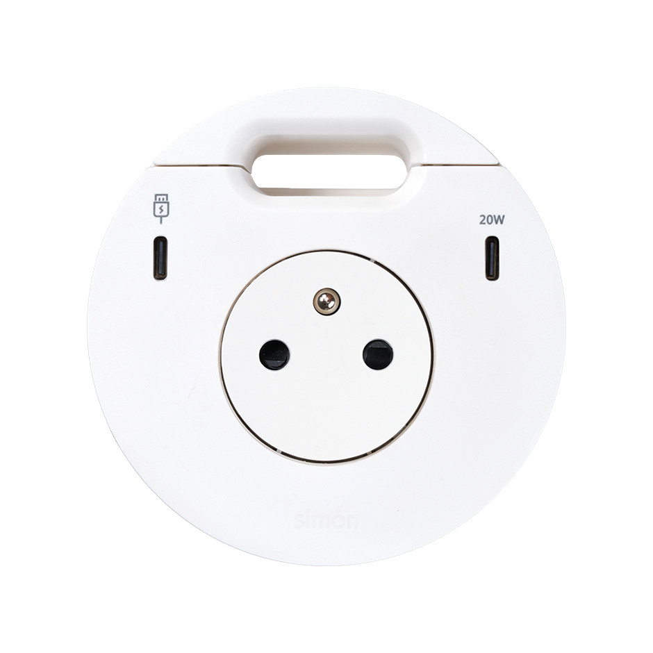 Simon 400 TS4-3332301-230 S400 Flash90,meblowe gniazdo zasilające z uziemieniem (bolec uziemiający) z ładowarką USB-C 20W, portem USB-C DATA i przepustem kablowym – stacja dokująca 1x HDMI + LAN + 3x USB-A ;biały