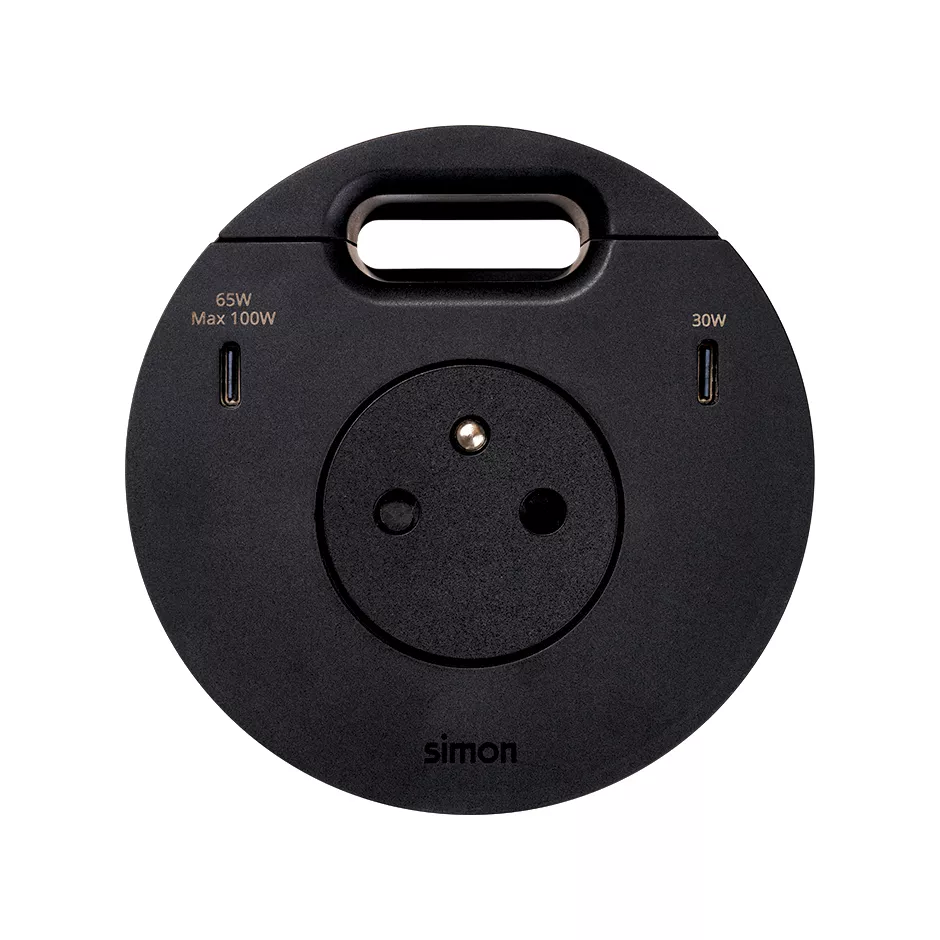 Simon 400 TS4-3351001-238 S400 Flash90,meblowe gniazdo zasilające z uziemieniem (bolec uziemiający) z ładowarką USB-C 100W i przepustem kablowym;czarny