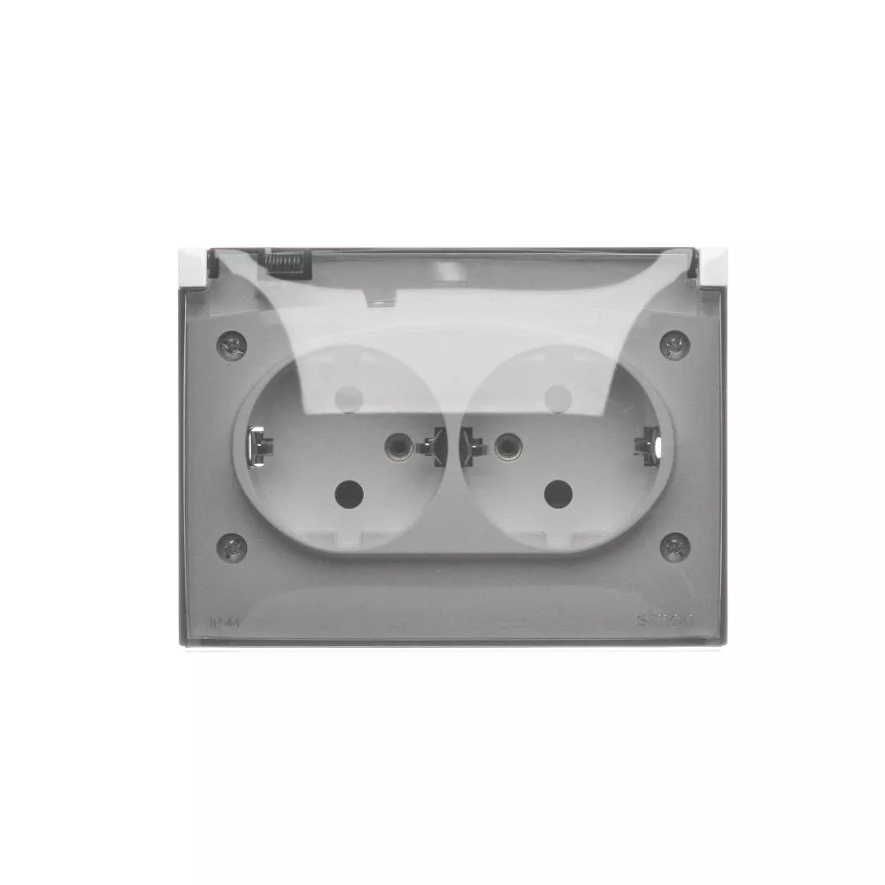 Simon Aquaclick WA-CGSZ2xx-xx-11Ax Gniazdo wtyczkowe natynkowe, Schuko, podwójne kompaktowe, klapka transparentna, IP44, 16A, 250V~, zaciski śrubowe; biały