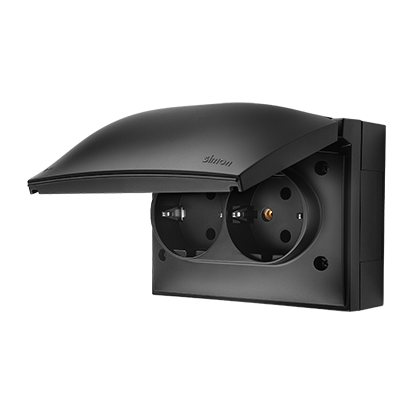 Simon Aquaclick WA-CGSZ2xx-xx-49xx Gniazdo wtyczkowe natynkowe, Schuko, podwójne kompaktowe, klapka w kolorze pokrywy, IP44, 16A, 250V~, zaciski śrubowe; czarny