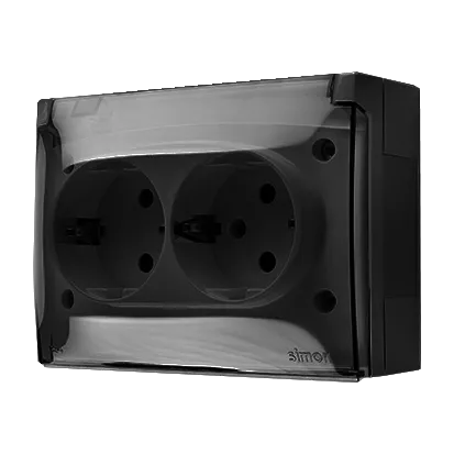 Simon Aquaclick WA-CGSZ2Zx-xx-49Ax Gniazdo wtyczkowe natynkowe, Schuko, podwójne kompaktowe, klapka transparentna, z przesłonami, IP44, 16A, 250V~, zaciski śrubowe; czarny
