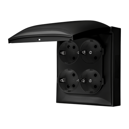 Simon Aquaclick WA-CGSZ4Cx-xx-49xx Gniazdo wtyczkowe natynkowe Schuko 4-krotne, klapka w kolorze pokrywy, IP44, 16A, 250V~, szybkozłącza; czarny