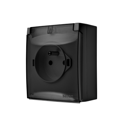 Simon Aquaclick WA-CGZ1Cxx-xx-49Ax Gniazdo wtyczkowe natynkowe, pojedyncze z uziemieniem, klapka transparentna, IP44, 16A, 250V~, szybkozłącza; czarny