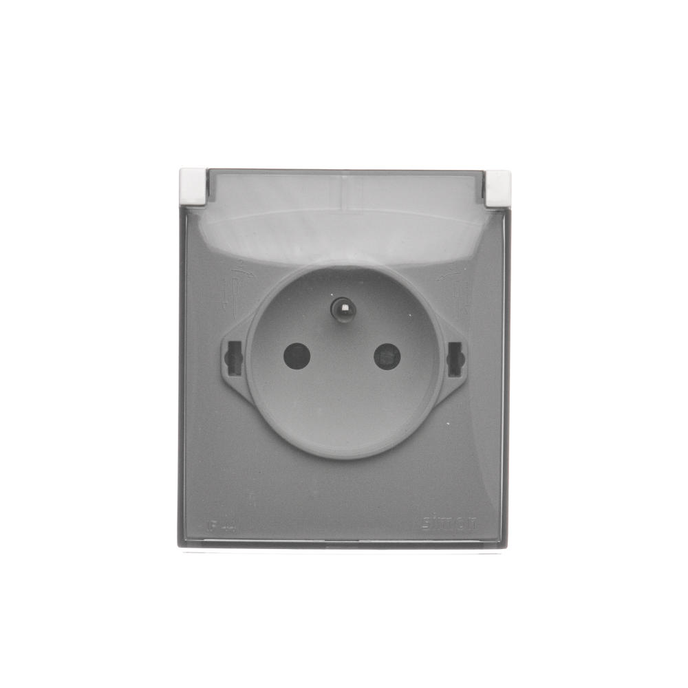 Simon Aquaclick WA-CGZ1CZx-xx-11Ax Gniazdo wtyczkowe natynkowe, pojedyncze z uziemieniem, klapka transparentna z przesłonami torów prądowych, IP44, 16A, 250V~, szybkozłącza; biały