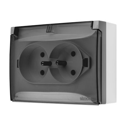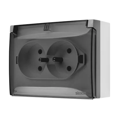 Simon Aquaclick WA-ACGZ2Zx-xx-16Ax Gniazdo wtyczkowe natynkowe, podwójne kompaktowe z uziem., klapka transparentna z przesł. torów prąd., IP44, Σ16A, 250V~, zaciski śrubowe; szary