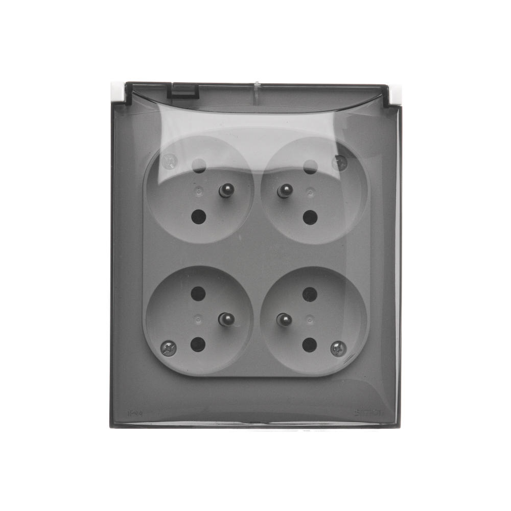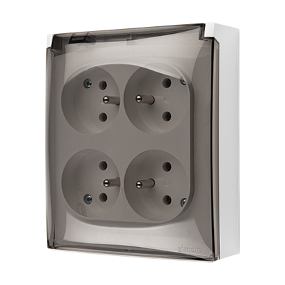 Simon Aquaclick WA-CGZ4xxx-xx-11Ax Gniazdo wtyczkowe natynkowe, 4-krotne z uziemieniem, klapka transparentna, IP44, Σ16A 250V~, zaciski śrubowe; biały