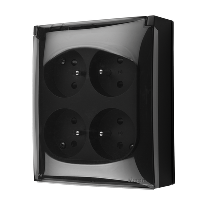Simon Aquaclick WA-CGZ4Cxx-xx-49Ax Gniazdo wtyczkowe natynkowe, 4-krotne z uziemieniem, klapka transparentna, IP44, Σ16A, 250V~, szybkozłącza; czarny
