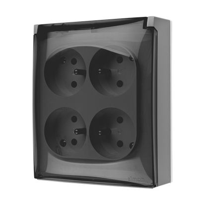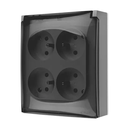 Simon Aquaclick WA-CGZ4Zxx-xx-16Ax Gniazdo wtyczkowe natynkowe, 4-krotne z uziemieniem, klapka transparentna z przesłonami torów prądowych, IP44, Σ16A, 250V~, zaciski śrubowe; szary