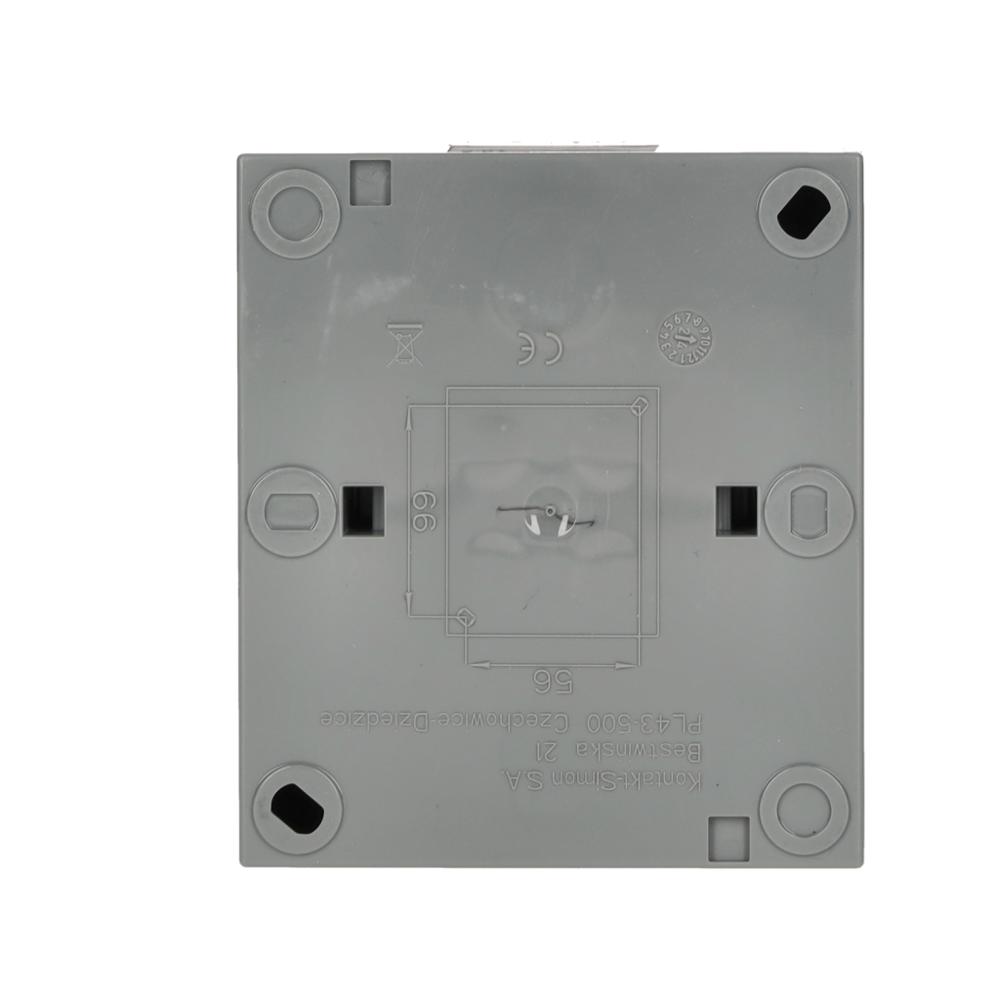 bez piktogramu Kolor ciemnoszary RAL (zbliżony) RAL 7001 Typ produktu kompletny produkt Prąd znamionowy świetlówkowy 10AX Napięcie znamionowe 250V Rodzaj podłączenia / Typ zacisku zaciski śrubowe Stopień ochrony IP IP44 Podświetlenie nie Klasa ETIM EC001590 Łącznik instalacyjny Nadruk/Piktogram brak Rodzaj materiału tworzywo sztuczne,