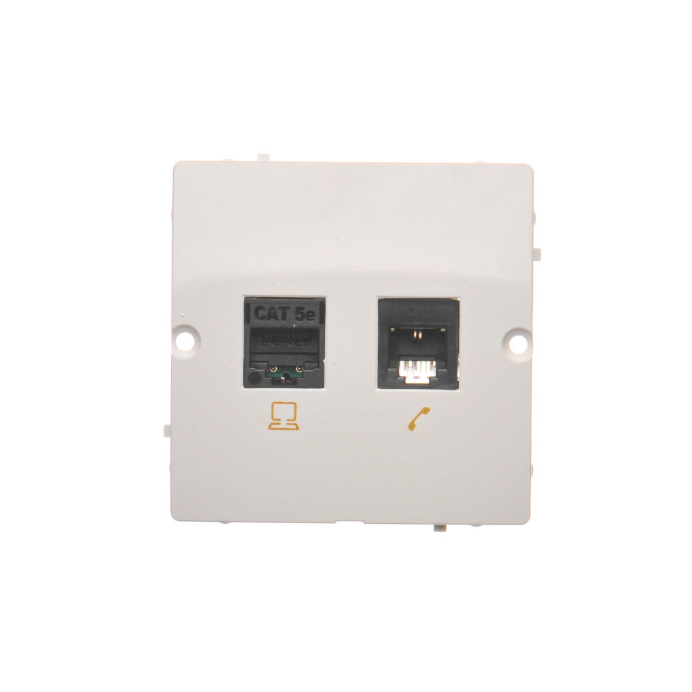 Simon Basic WMUM-0500F2-1011 Gniazdo komputerowe RJ45 kat.5e + telefoniczne RJ11 (moduł). Montaż gniazda na wkręty do puszki; biały