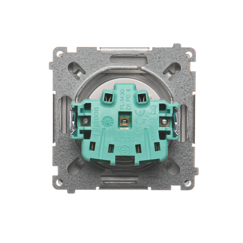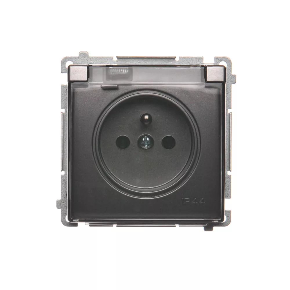 Simon Basic WMUW-53110x-J021 Gniazdo wtyczkowe z uziemieniem, bryzgoszczelne IP44 (moduł) 16A, 250V~, zaciski śrubowe. Klapka transparentna; stal inox