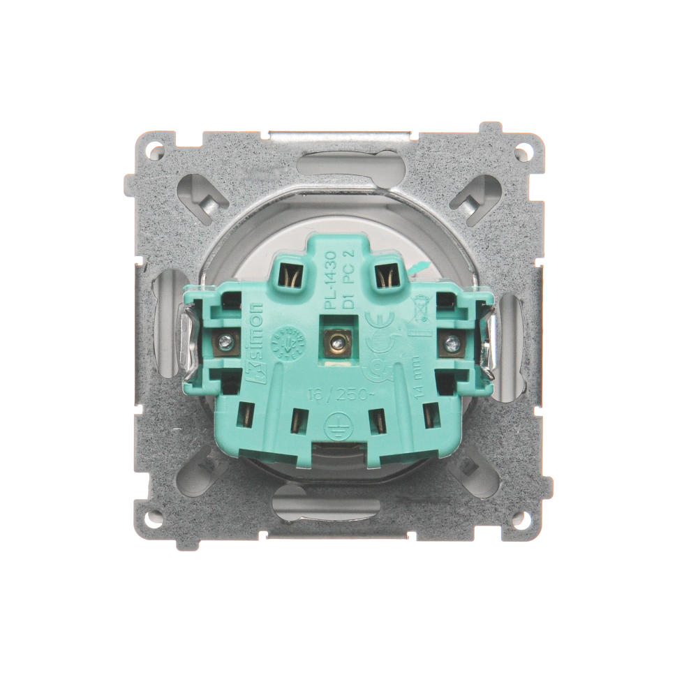 Simon Basic WMUW-53111x-4021 Gniazdo wtyczkowe z uziemieniem, z przesł. torów prądowych, bryzgoszczelne IP44 (moduł) 16A, 250V~, zaciski śrubowe, klapka transp.; srebrny mat