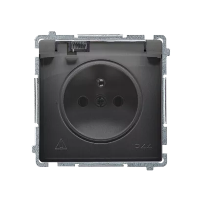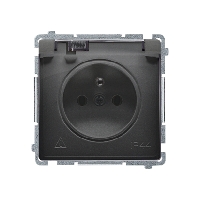 Simon Basic WMUW-53111x-Y021 Gniazdo wtyczkowe z uziemieniem, z przesł. torów prądowych, bryzgoszczelne IP44 (moduł) 16A, 250V~, zaciski śrubowe, klapka transp.; czarny
