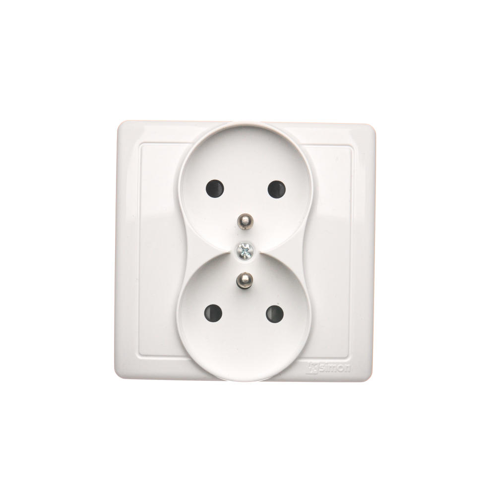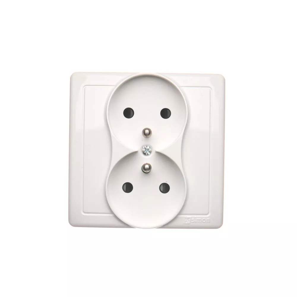 Simon Basic WMUW-10211x-1011 Gniazdo wtyczkowe z uziemieniem podwójne, monoblok, z przesłonami torów prądowych 16A, 250V~, zaciski śrubowe; biały Kompletne - nie do ramek