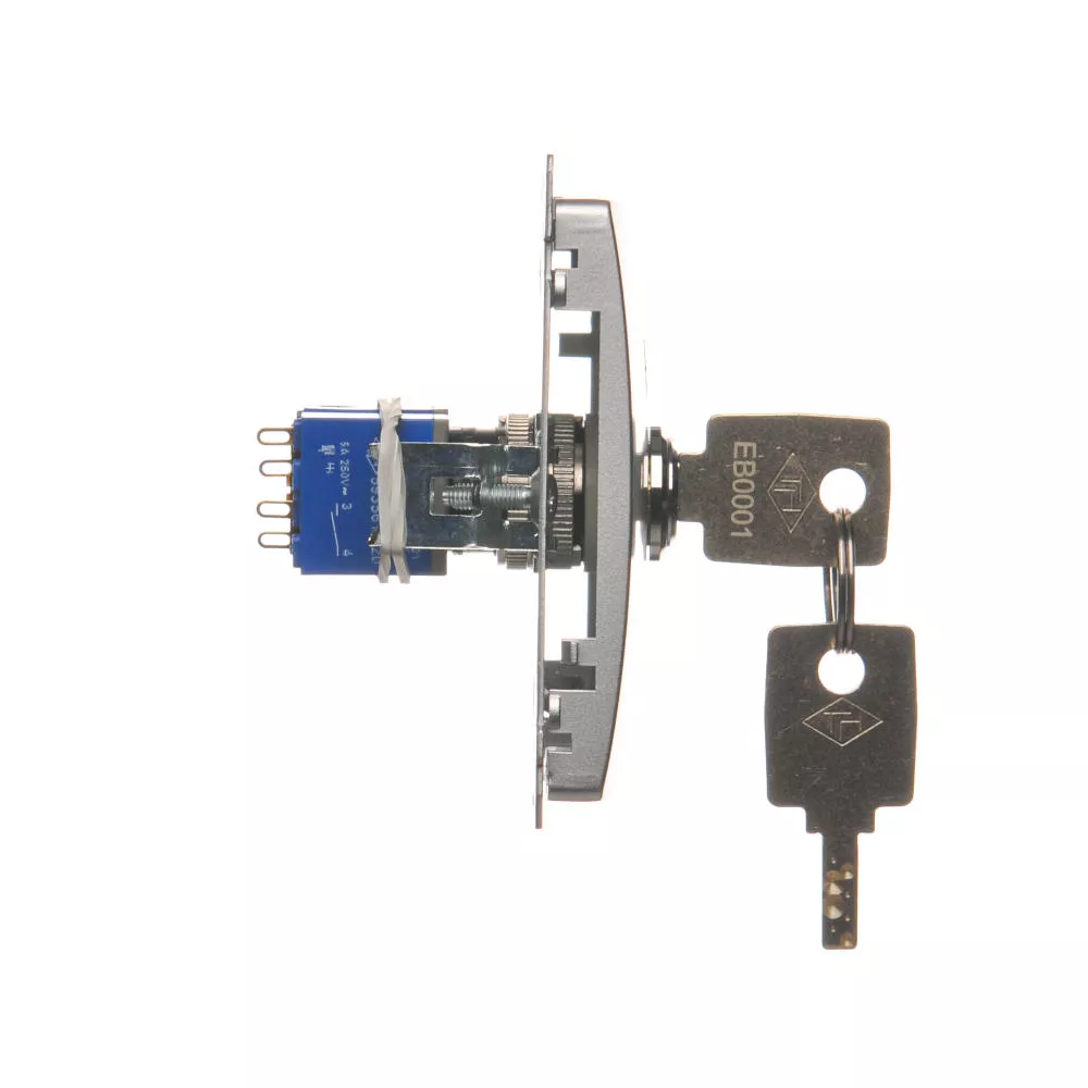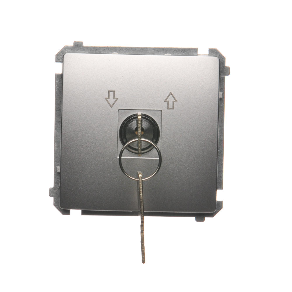 Simon Basic WMUL-0K04Px-4011 Łącznik chwilowy roletowy z kluczem, 3 pozycyjny, „I-0-II" 2 styki N/O. Możliwość wyjęcia klucza tylko w pozycji 0; srebrny mat
