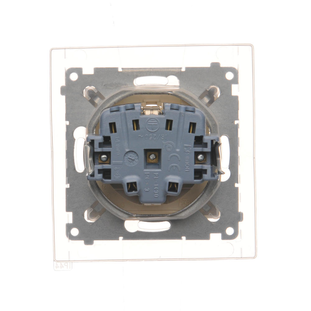 | Nazwa produktu/Rodzaj | gniazdo wtyczkowe pojedyncze do wersji IP44 z uziemieniem typu Schuko z przesłonami torów prądowych - z uszczelką ramki - klapka w kolorze transparentnym |