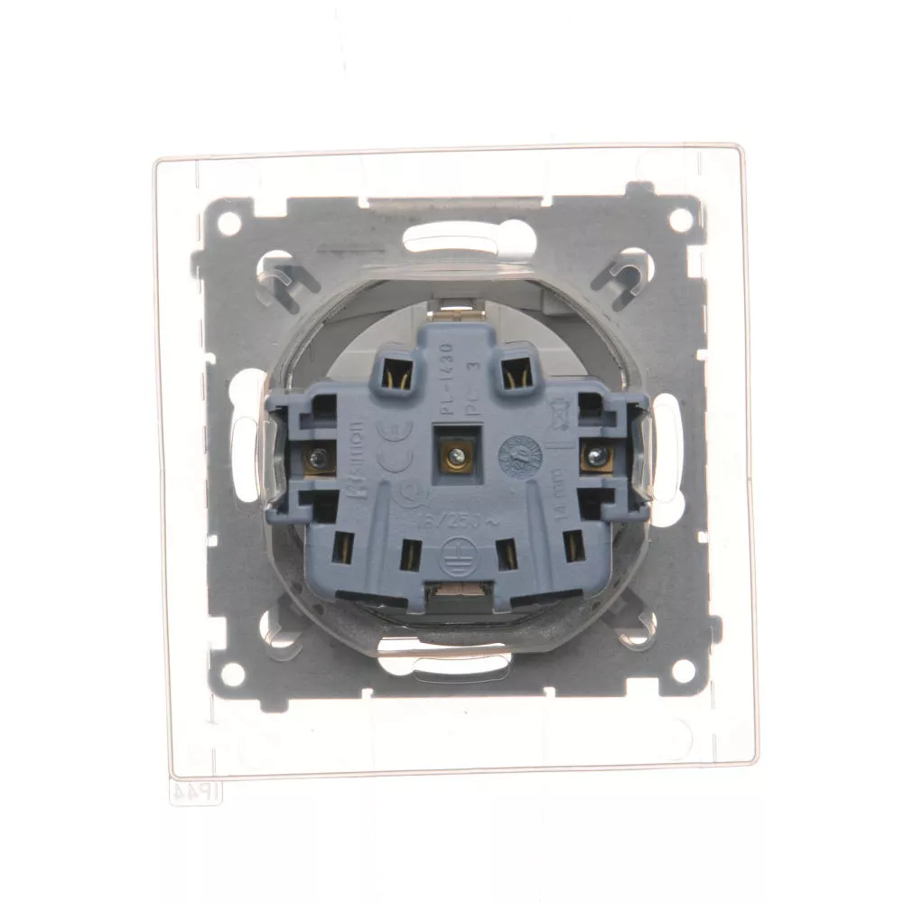 | Nazwa produktu/Rodzaj | gniazdo wtyczkowe pojedyncze do wersji IP44 z uziemieniem typu Schuko z przesłonami torów prądowych - z uszczelką ramki - klapka w kolorze transparentnym |
