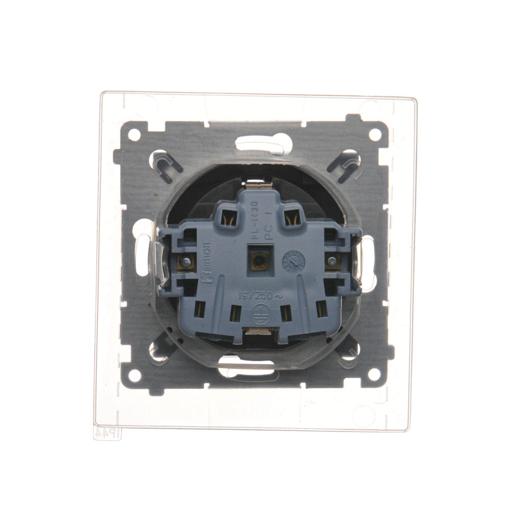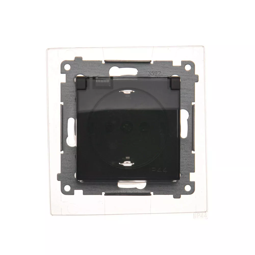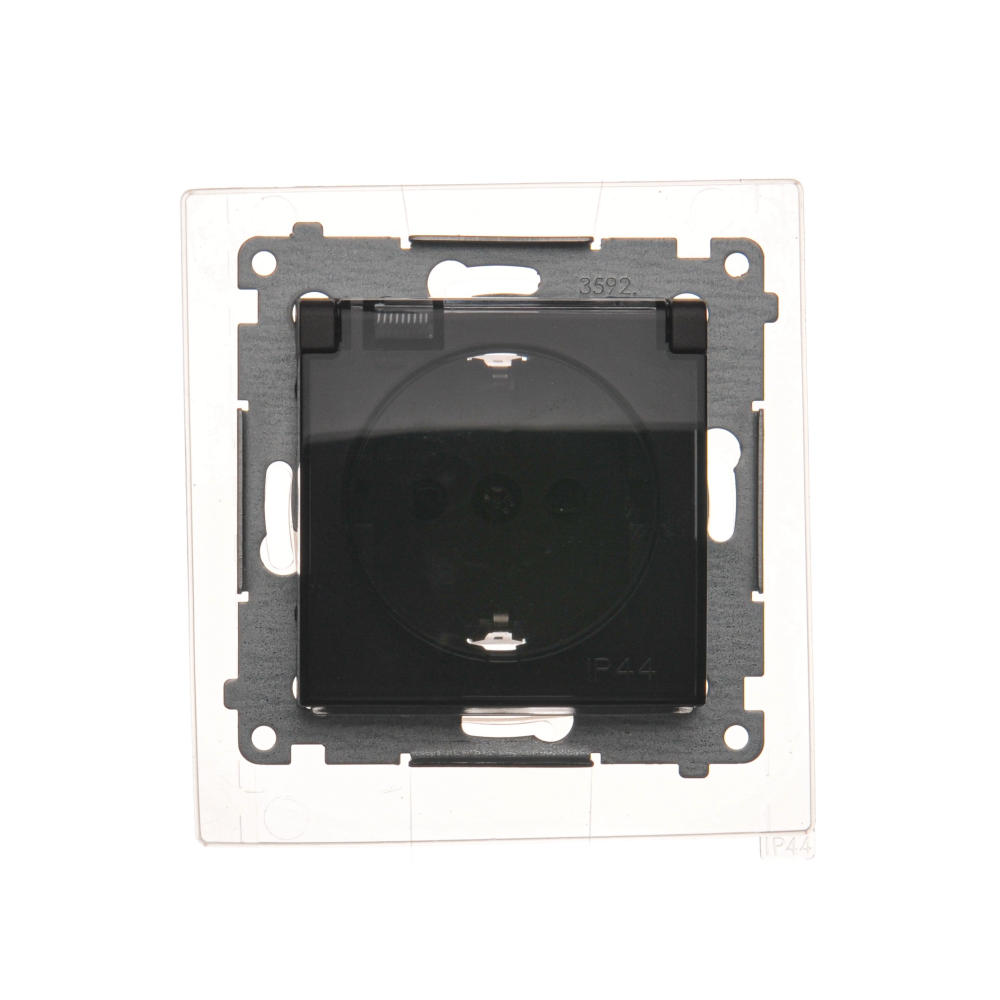 | Nazwa produktu/Rodzaj | gniazdo wtyczkowe pojedyncze do wersji IP44 z uziemieniem typu Schuko z przesłonami torów prądowych - z uszczelką ramki - klapka w kolorze transparentnym |
