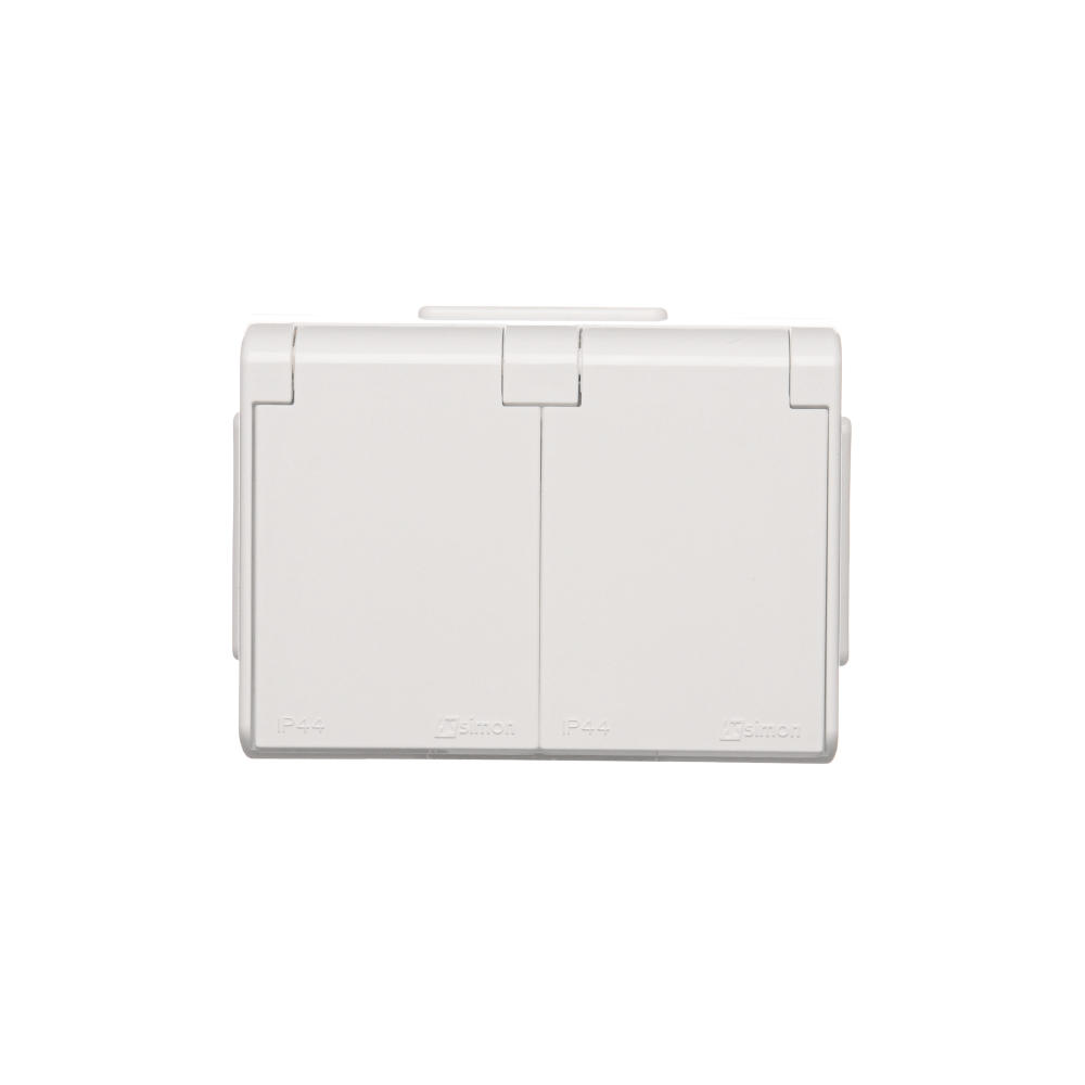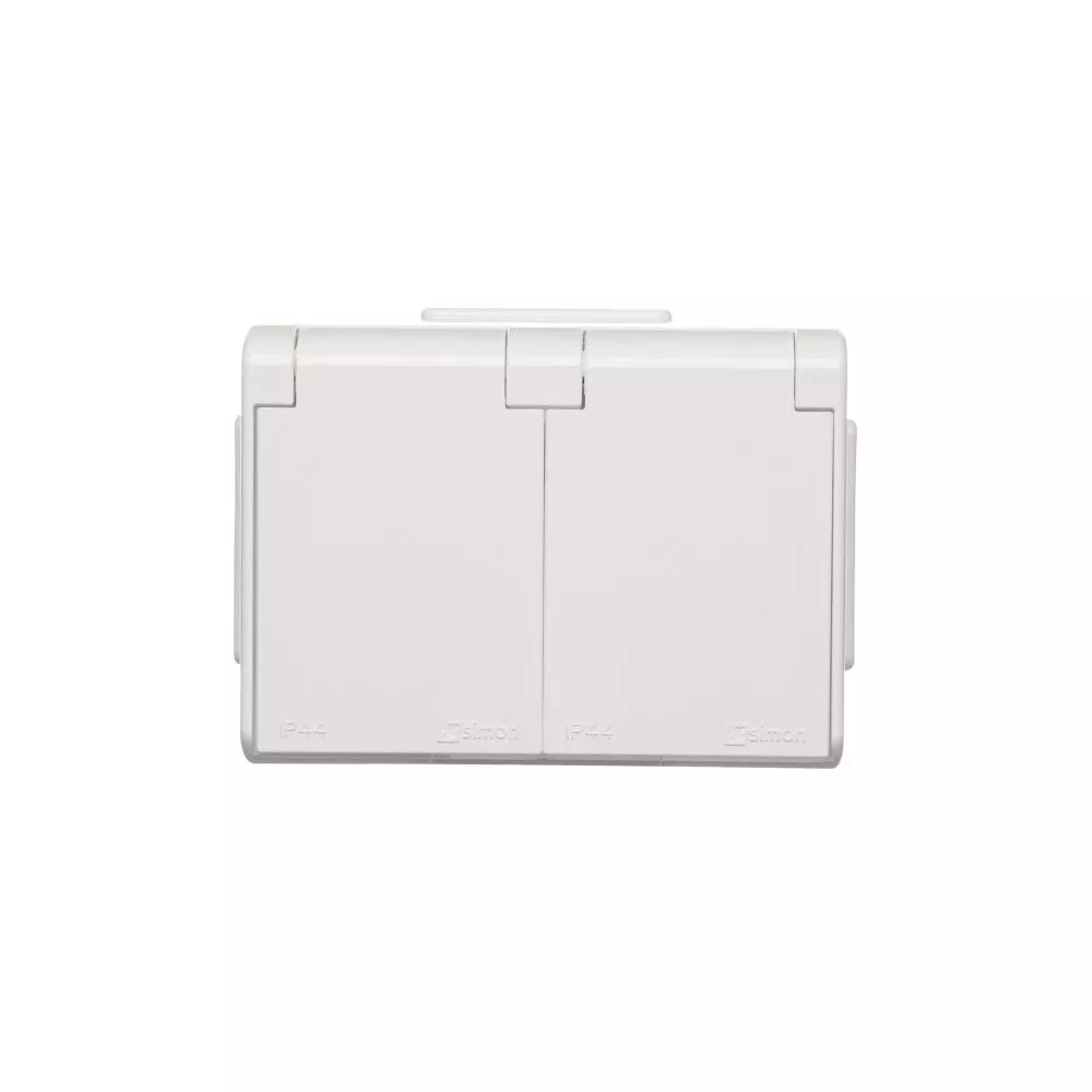 Simon 54 WMEW-32211x-101 Gniazdo podwójne Schuko natynkowe bryzgoszczelne IP44 z przesłonami wersja skandynawska 16A, 250V~, zaciski śrubowe; biały
