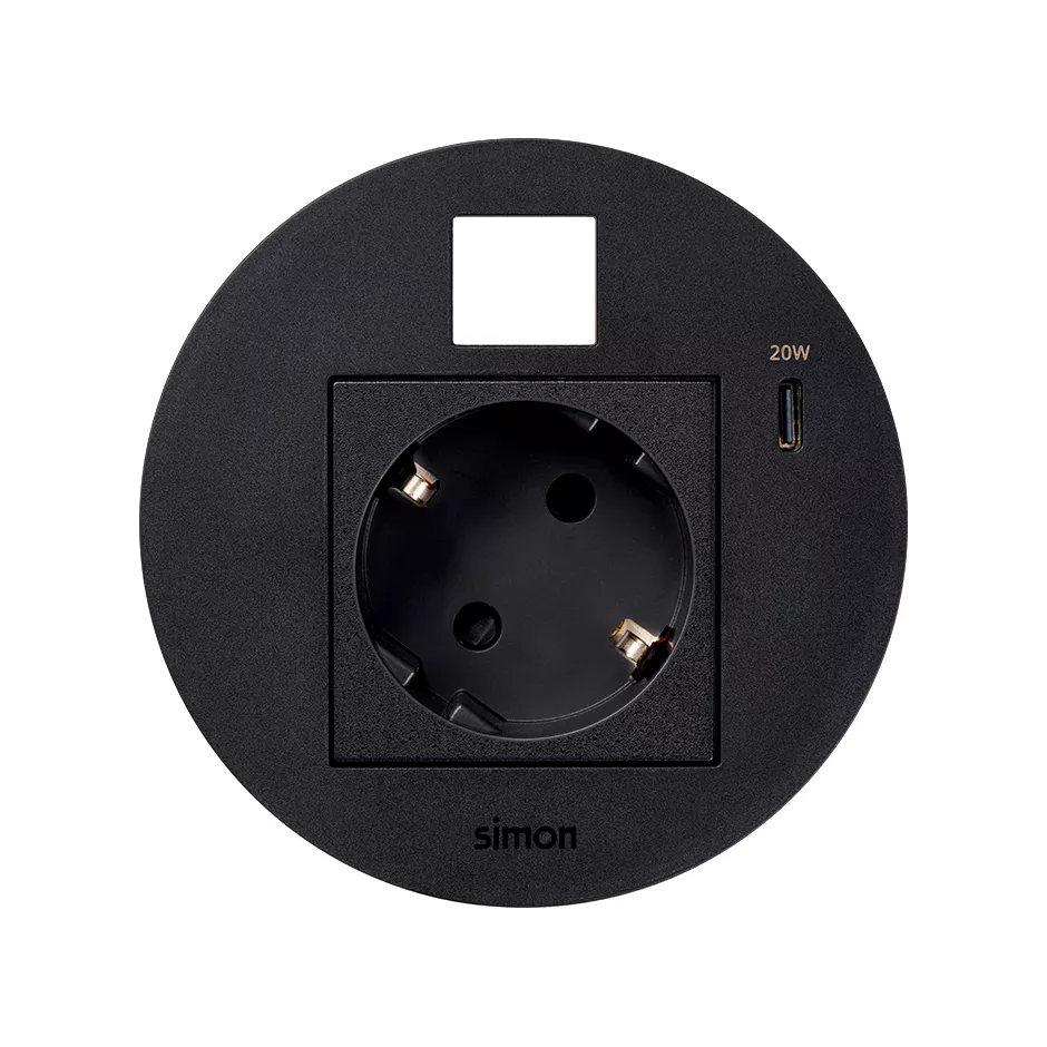 Simon 400 TS4-KR3310013-14 S400 Flash90 K45,meblowe gniazdo zasilające z uziemieniem (Schuko) z ładowarką USB-C 20W i plakietką RJ45 z mocowaniem Keystone;czarny