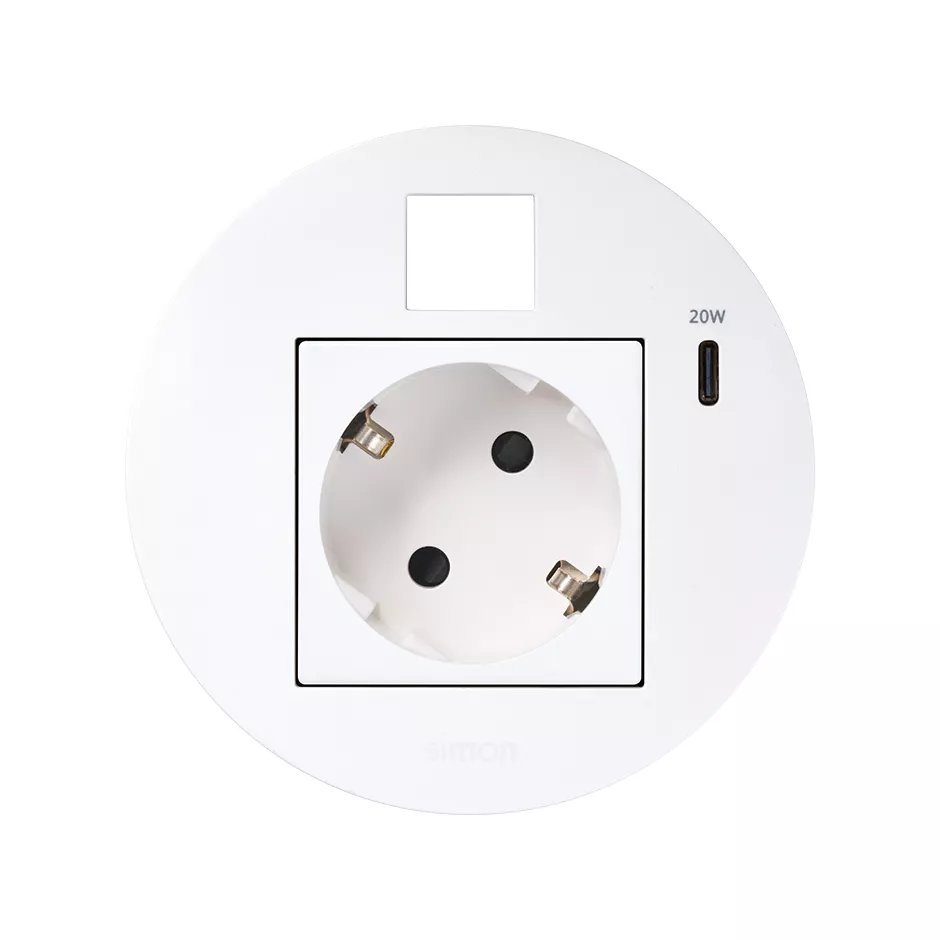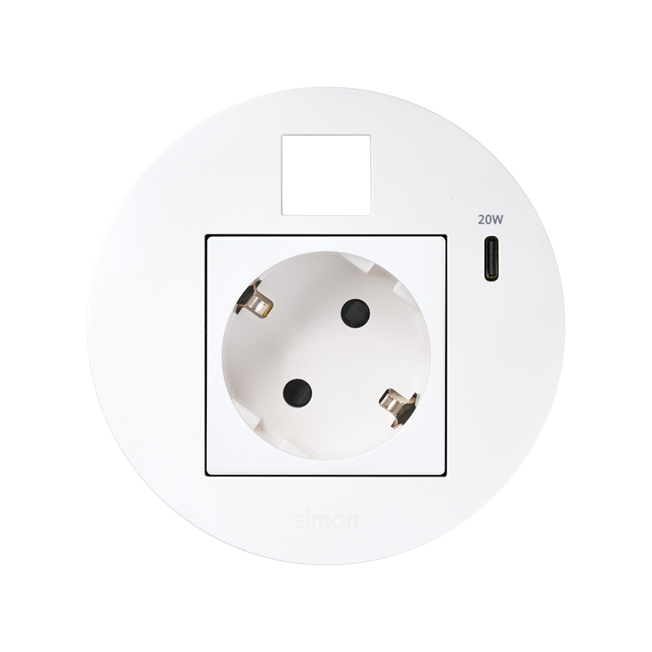 Simon 400 TS4-KR3310013-9 S400 Flash90 K45,meblowe gniazdo zasilające z uziemieniem (Schuko) z ładowarką USB-C 20W i plakietką RJ45 z mocowaniem Keystone;biały