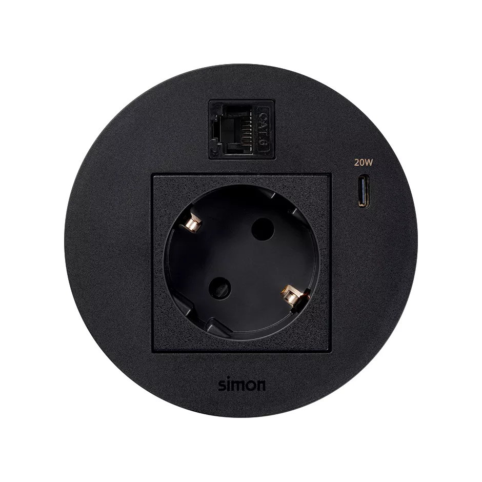 Simon 400 TS4-KR3310023-14 S400 Flash90 K45,meblowe gniazdo zasilające z uziemieniem (Schuko) z ładowarką USB-C 20W i złączem RJ45 kat. 6 UTP (mocowanie Keystone);czarny