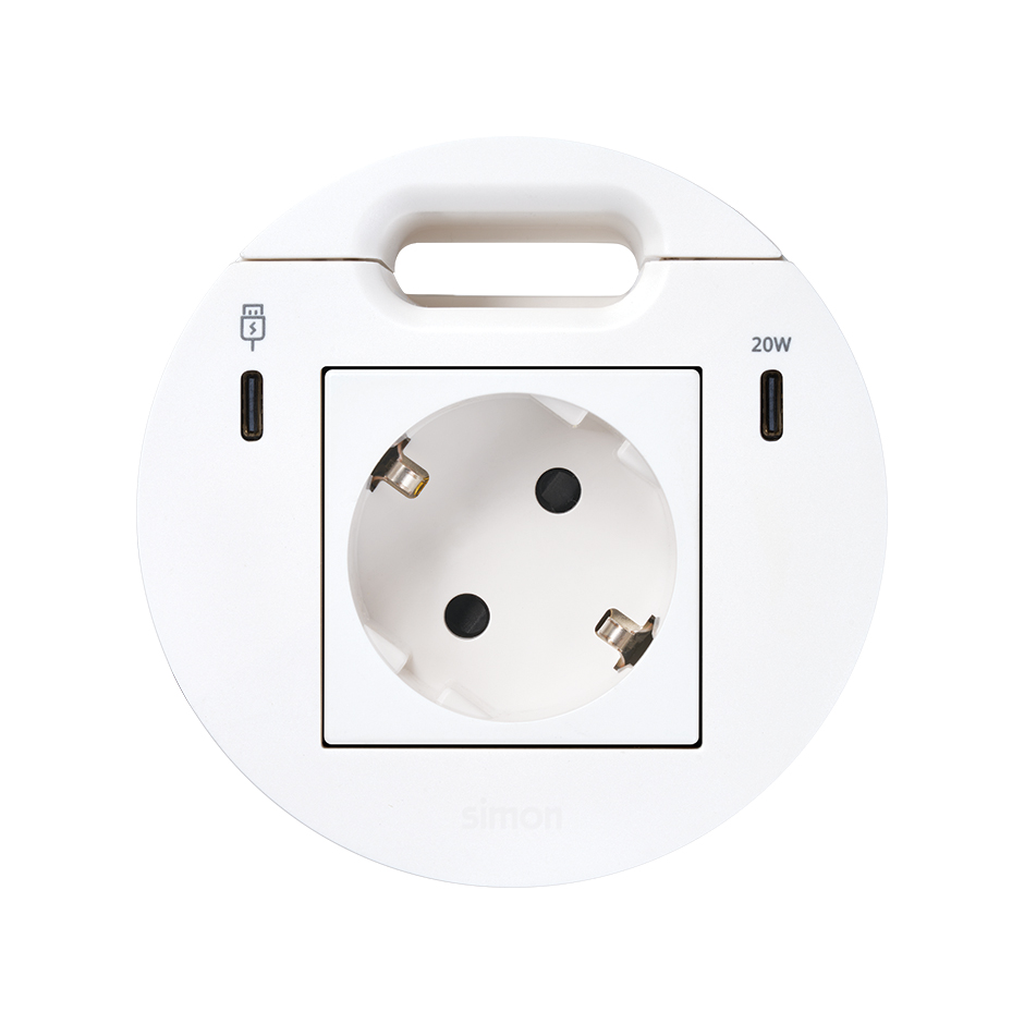Simon 400 TS4-KR3311301-9 S400 Flash90 K45,meblowe gniazdo zasilające z uziemieniem (Schuko) z ładowarką USB-C 20W, portem USB-C DATA i przepustem kablowym – stacja dokująca 1x HDMI + LAN + 3x USB-A ;biały