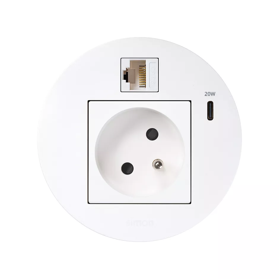 Simon 400 TS4-KR3320023-9 S400 Flash90 K45,meblowe gniazdo zasilające z uziemieniem (bolec uziemiający) z ładowarką USB-C 20W i złączem RJ45 kat. 6 UTP (mocowanie Keystone);biały