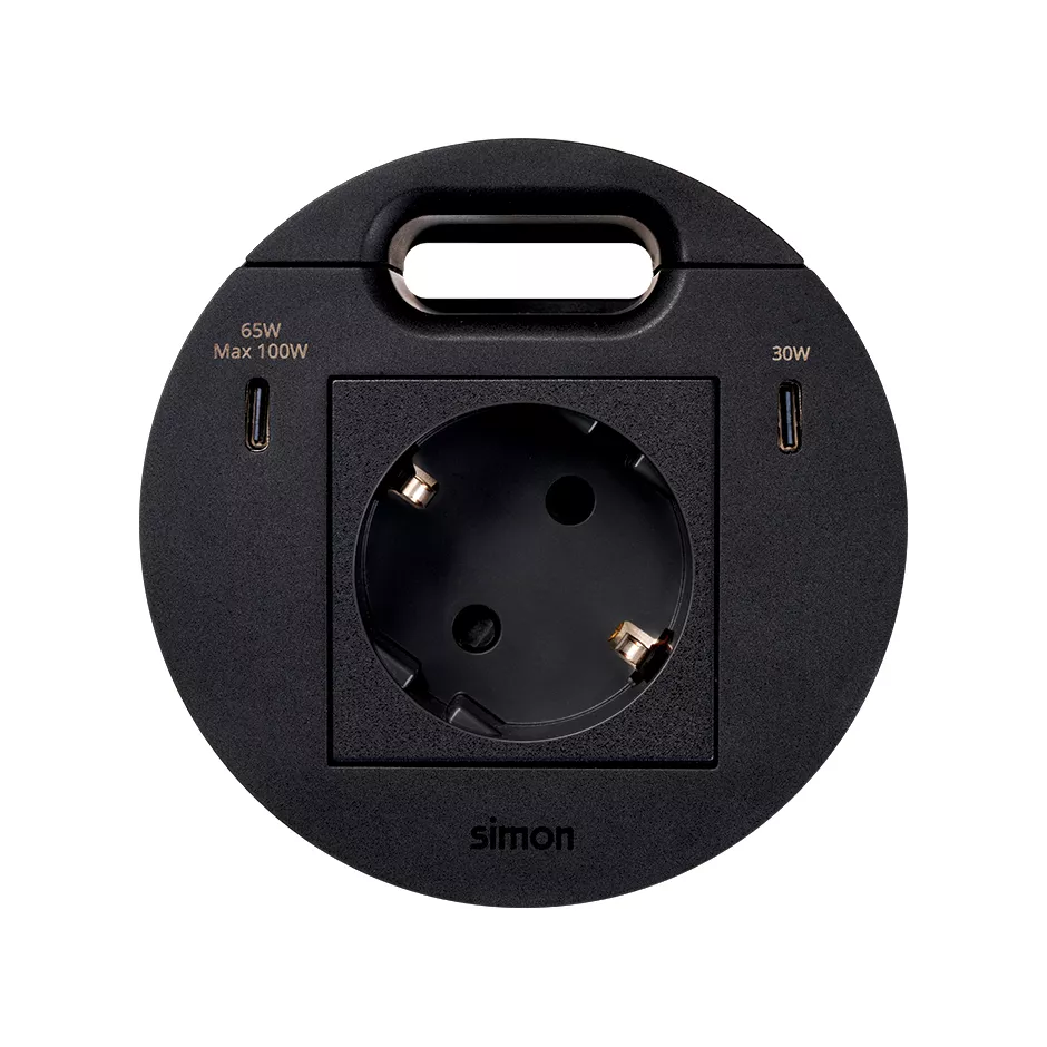 Simon 400 TS4-KR3510001-14 S400 Flash90 K45, meblowe gniazdo zasilające z uziemieniem (Schuko) z ładowarką USB-C 100W i przepustem kablowym, IP20, 16A, czarny, wym. montażowe: Ø80mm;czarny