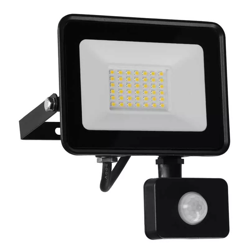 Naświetlacz LED 30W strumień użyteczny 2400lm 4000K 120° 143x183x26, obu. alu IP54 PF>0,9 PIR, klasa energetyczna F