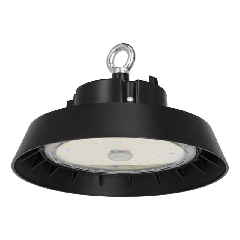 Oprawa High-Bay LED, 100/80/60W, strumień całkowity 20000/16000/12000lm, strumień użyteczny 16000/13000/10000lm (dla kąta 120°), skuteczność 200lm/W, regulacja jasności 1-10V, 4000K, kąt świecenia 120°, klasa energetyczna B, materiał: aluminium/PC, wymiary D260x165mm, IP65, IK09, gwarancja 5 lat