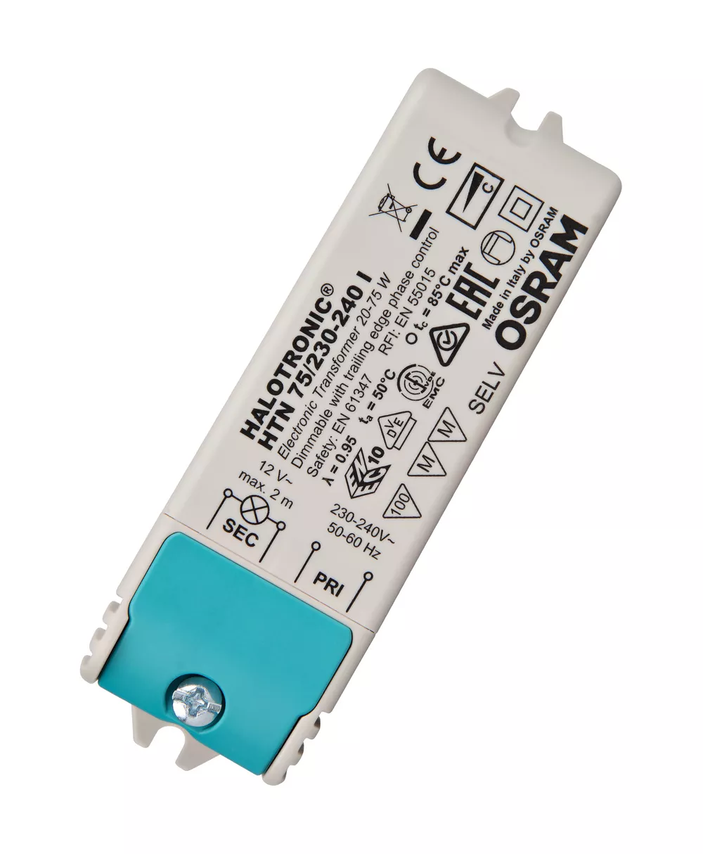 Zasilacze elektroniczne do żarówek halogenowych niskonapięciowych. Cechy produktu: Częstotliwość linii: 50…60 Hz. Tłumienie RI: zgodnie z PN-EN 55015 (A1: 2007)/CISPR 15, PN-EN 55022. Harmoniczne prąd:u zgodnie z PN-EN 61000-3-2. Odporność zgodna z normą EN 61547. Bezpieczeństwo: zgodnie z PN-EN 61347. Ochrona przed zwarciem, przeciążeniem, przegrzaniem: elektroniczne odwracalne. Izolacja elektryczna między uzwojeniem pierwotnym i uzwojeniem wtórnym. Niedozwolone przełączanie pomiędzy elektronicznym transformatorem a lampą. Wydajność energetyczna: ≥ 91 % (zgodnie z rozporządzeniem ErP 2012/1194/EC). Ściemnialne za pomocą regulatora fazowego zbocze narastające (bez HTN) i opadające. Zalety produktu: Bardzo niskie straty mocy dzięki wysokiej sprawności. Uchwyt odciążający dostosowany do różnych typów przewodów (HTM). Przystosowany do instalacji przy krytycznie małej ilości miejsca dzięki kompaktowej, funkcjonalnej konstrukcji. Wyjątkowo kompaktowy transformator umożliwiający instalację w warunkach krytycznie małej ilości miejsca (HTN). Ochrona pracy podczas całego zakresu obciążenia częściowego, zapewniająca długą trwałość lampy. Obszary zastosowań: Oświetlenie efektowe i akcentujące. Salony. Oświetlenie obiektów. Pomieszczenia konferencyjne. Restauracje. Oprawy meblowe wpuszczane i montowane na powierzchni. Oświetlenie sklepowe. Pomieszczenia klubowe.