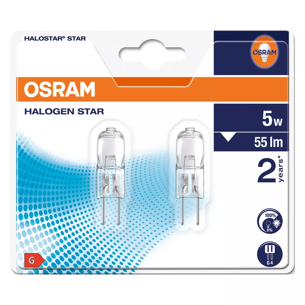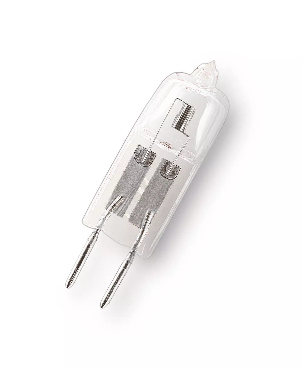 Niskonapięciowe żarówki halogenowe z trzonkiem kołkowym. Cechy produktu: Średnia trwałość: 2000 h. 100% ściemnialne. Wskaźnik oddawania barw R<sub>a</sub>: 100. Trzonek: G4, GY6.35. Zalety produktu: Brylantowe oświetlenie akcentujące. Niezwykle małe wymiary, umożliwiające tworzenie nowych opraw o rewolucyjnym wzornictwie. Zatwierdzone do zastosowania w otwartych oprawach oświetleniowych (zgodnie z PN-EN 60598-1). Filtr UV. Obszary zastosowań: Oświetlenie kuchni. Oświetlenie luster. Oświetlenie do czytania. Oświetlenie awaryjne. Sklepy. Restauracje, hotele i inne prestiżowe zastosowania. Biura, budynki publiczne. Porady dotyczące bezpieczeństwa: Nie dotykaj lampy, jeśli jest stłuczona.. Nie wolno używać, jeśli zewnętrzne źródło światła jest uszkodzone.. Lampa przeznaczona do stosowania wyłącznie w oprawie zamkniętej..
