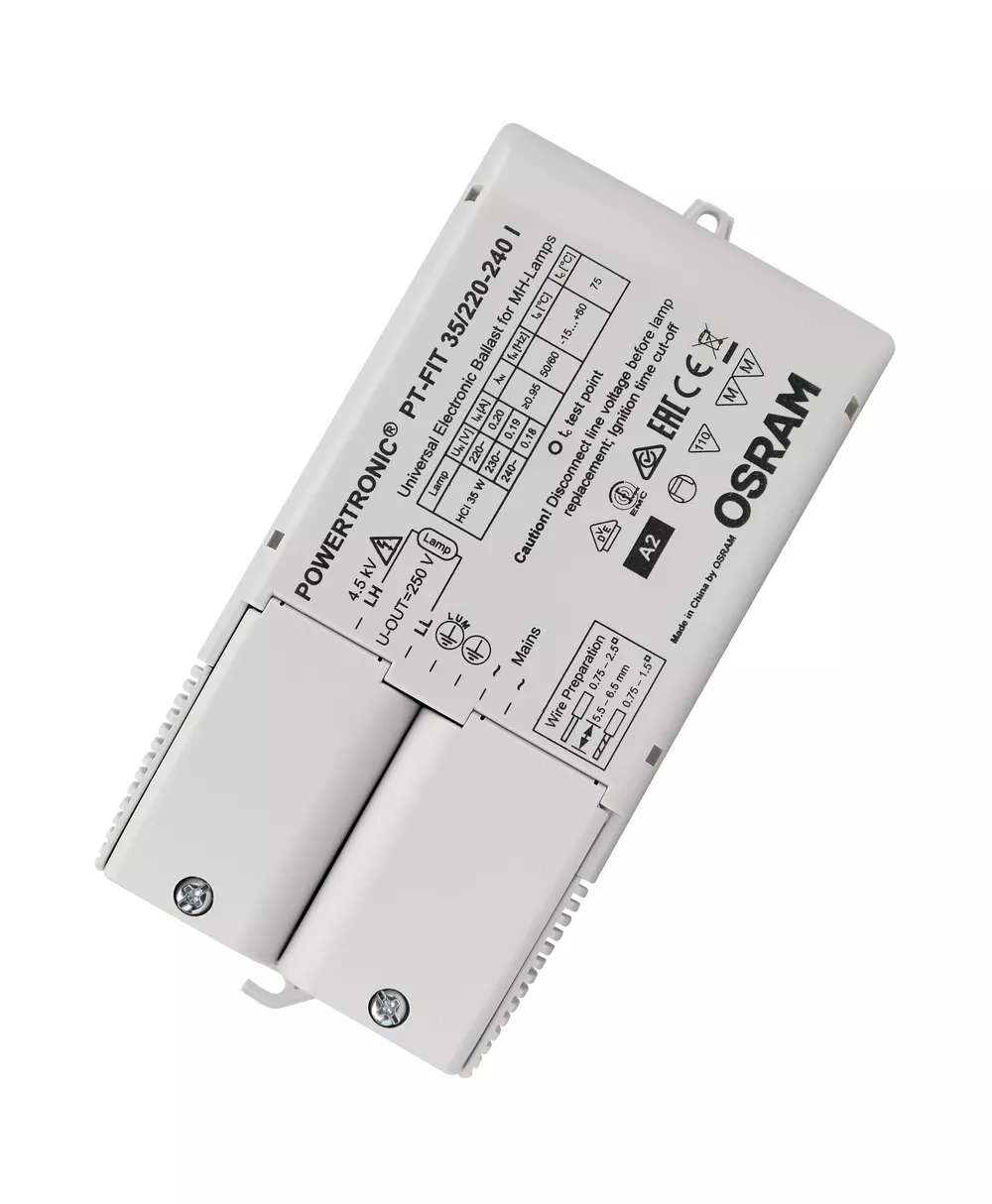 Stateczniki elektroniczne do lamp wyładowczych z zaciskiem do przewodów. Cechy produktu: Wskaźnik sprawności energetycznej EEI: A2. Napięcie zasilania: 220…240 V. Częstotliwość linii: 50…60 Hz. Tłumienie RI: zgodnie z PN-EN 55015/CISPR 15. Bezpieczeństwo: zgodnie z PN-EN 61347-2-12. Harmoniczne prąd:u zgodnie z PN-EN 61000-3-2. Odporność zgodna z normą EN 61547. Zalety produktu: Elektroniczny układ zasilający z ergonomicznym uchwytem odciążającym umożliwiającym prawidłową instalację w sufitach podwieszanych. Zoptymalizowany współczynnik cena / korzyść. Automatyczne wyłączenie lamp w przypadku usterki lub przy End of Life (EoL). Obszary zastosowań: Oświetlenie sklepowe. Centra zdrowia i odnowy biologicznej (w suchych, zabezpieczonych przed korozją miejscach). Oświetlenie efektowe i akcentujące. Porady dotyczące bezpieczeństwa: Charakterystyka termiczna Ulatnianie się gazów i promieniowanie cieplne mogą prowadzić do akumulacji ciepła w całkowicie zamkniętej obudowie. Dlatego należy sprawdzić, czy temperatura w punkcie pomiaru tc elektronicznego układu zasilającego nie przekracza wartości maksymalnej.. Uwaga! Ze względów bezpieczeństwa odłączyć urządzenie przed wymianą lampy!.