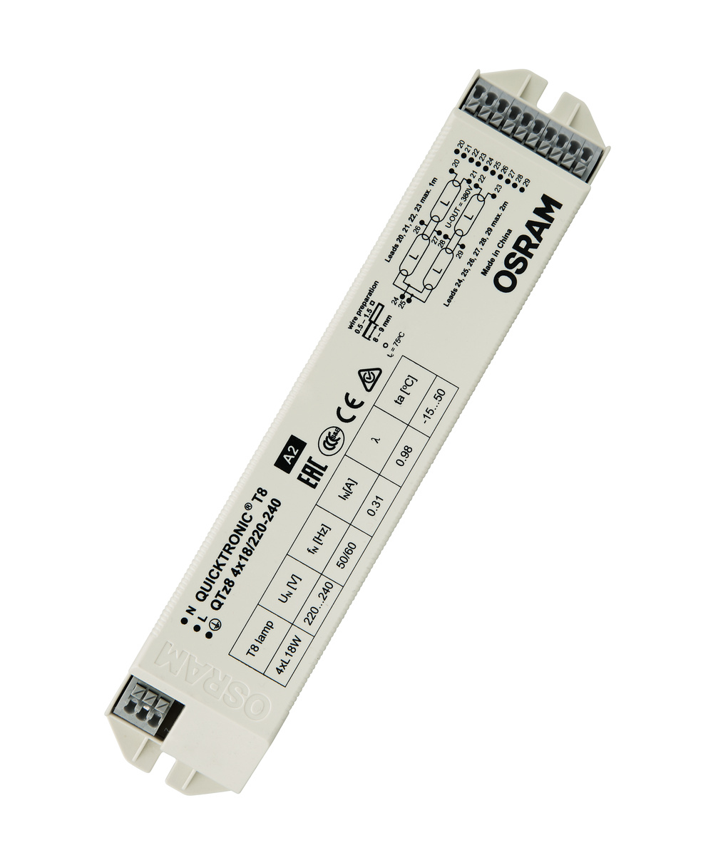 Stateczniki elektroniczne do świetlówek liniowych T8/Æ o średnicy 26 mm. Cechy produktu: Napięcie zasilania: 220…240 V. Napięcie sieciowe: 198…264 V. Częstotliwość linii: 50 Hz | 60 Hz. Wskaźnik sprawności energetycznej EEI: A2. Zalety produktu: Kompaktowa obudowa. Automatyczny restart po wymianie lampy. Obszary zastosowań: Budynki publiczne. Hale sportowe. Linie świetlne. Przeznaczony do opraw o klasie ochronności I.