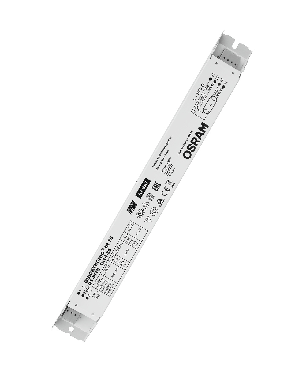 Stateczniki elektroniczne do świetlówek liniowych T5 (16 mm). Cechy produktu: Napięcie zasilania: 220…240 V. Napięcie sieciowe: 198…264 V. Częstotliwość linii: 50 Hz | 60 Hz. Włączenie lampy z optymalnym wstępnym podgrzewaniem. Wskaźnik sprawności energetycznej EEI: A2. Automatyczne wyłączenie niesprawnych lamp po upływie trwałości (EoL T.2). Praca lampy: zgodnie z PN-EN 60929. Bezpieczeństwo: zgodnie z PN-EN 61347-2-3. Zalety produktu: Długa trwałość lampy. Częste włączanie / wyłączanie nie ma negatywnego wpływu. Automatyczny restart po wymianie lampy. Doskonałe włączenie lampy dla zastosowań z czujnikami ruchu. System z certyfikacją VDE/VDE EMC. Bardzo wysoka sprawność uzyskana dzięki technologii samoczynnego odłączenia. Obszary zastosowań: Biura wielkopowierzchniowe, korytarze i magazyny. Budynki publiczne. Linie świetlne. Przeznaczone dla oświetlenia awaryjnego (zasilanie prądem stałym). Przeznaczony do opraw o klasie ochronności I. Modernizacja starszych systemów.