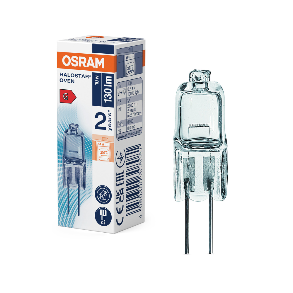 Niskonapięciowe żarówki halogenowe z trzonkiem kołkowym do oświetlania piekarników. Zalety produktu: Dwa do trzech razy większa skuteczność świetlna, niż w przypadku konwencjonalnego oświetlenia pieca. Optymalna zawartość halogenów dla wysokich temperatur. Wtyki z hartowanej stali zapewniające niezawodny kontakt przy wysokich temperaturach. Przeznaczone do pirolizy (dopuszczalna temperatura otoczenia 450 °C). Nie zawiera rtęci. Obszary zastosowań: Piekarniki. Porady dotyczące bezpieczeństwa: Nie dotykaj lampy, jeśli jest stłuczona.. Nie wolno używać, jeśli zewnętrzne źródło światła jest uszkodzone.. Lampa przeznaczona do stosowania wyłącznie w oprawie zamkniętej.. Nie jest przeznaczony do zastępowania tradycyjnego oświetlenia w gospodarstwach domowych..
