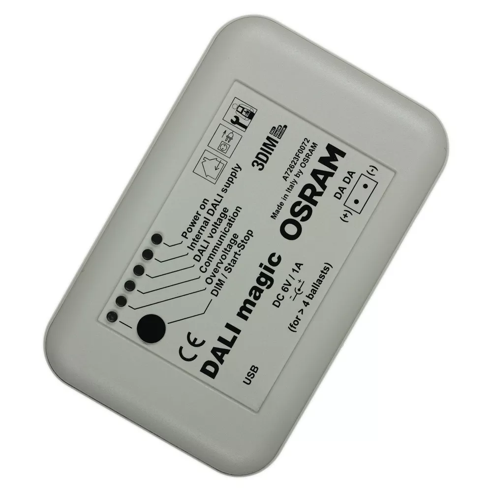 USB do interfejsu DALI. Cechy produktu: Konwerter USB-DALI do Tuner4TRONIC™ i oprogramowanie DALI Wizard do komputerów Windows. Przycisk testujący przyciemnianie DALI bez konieczności połączenia z komputerem. Zasianie przez USB lub dołączony uniwersalny zasilacz. Wewnętrzne automatyczne zasilanie DALI aż do 64 urządzeń (do 4 zasilanych przez USB). Obszary zastosowań: Konfiguracja funkcji statecznika elektronicznego DALI. Monitorowanie instalacji DALI. Wyposażenie / Akcesoria: Zasilacz uniwersalny (100…240 VAC, 5,9 VDC, 1,15 A, wtyczka UE). Przewód USB (złącze męskie A - złącze męskie B), 180 cm. Dwubiegunowa wtyczka do podłączenia DALI.