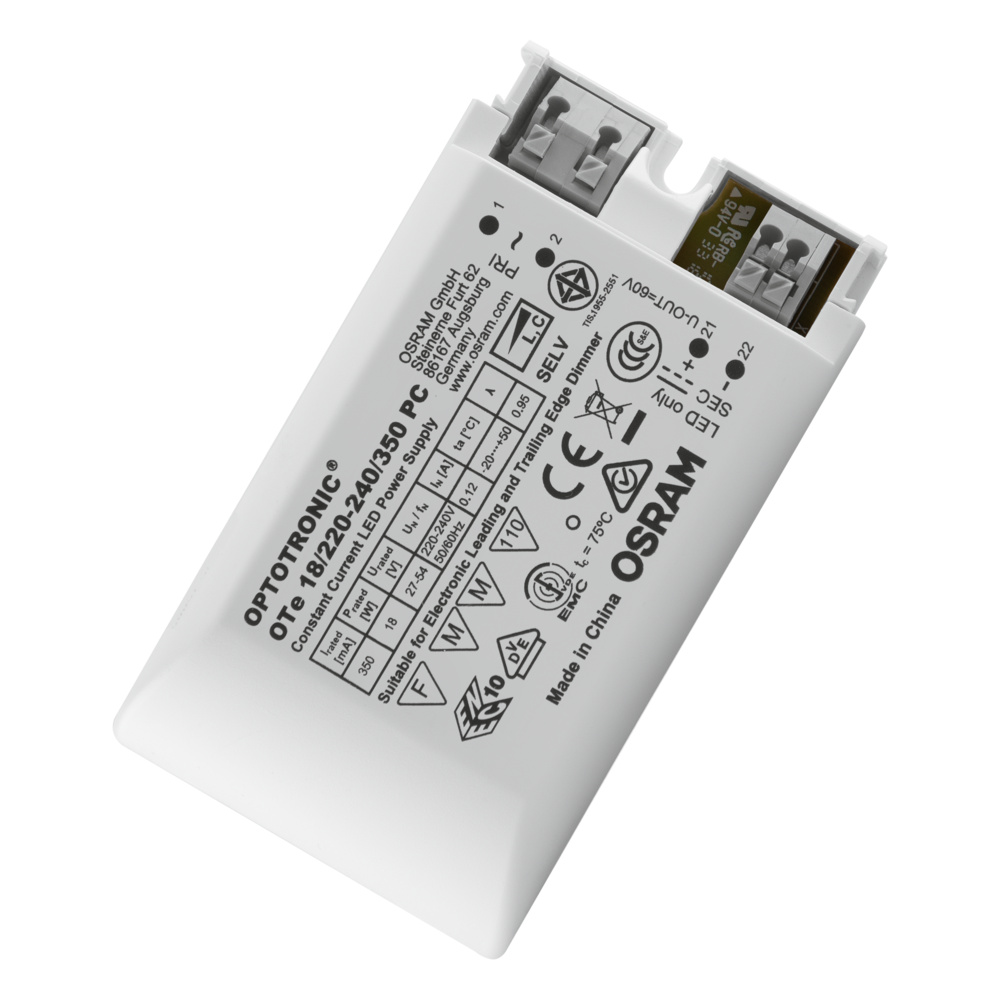 Kompaktowe zasilacze prądowe do LED. Cechy produktu: Możliwość regulacji zboczem narastającym i opadającym. Zalety produktu: Kompaktowa obudowa do montażu na bardzo ograniczonej powierzchni. Kompatybilny z większością popularnych regulatorów fazowych. Obszary zastosowań: Opcjonalny zacisk przewodu w kształcie E przeznaczony do niezależnego montażu (zamawiany oddzielnie). Nadaje się do instalacji wewnętrznych.