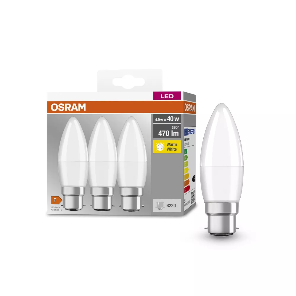 Lampy LED w kształcie klasycznej żarówki świecowej. Cechy produktu: Profesjonalne lampy dla napięcia sieciowego. Nieprzystosowane do pracy z regulatorami. Dobre oddawanie barw (Ra ≥ 80) i stabilność braw przez cały czas eksploatacji lampy. Trzonek: E14, B22d. Lampy niezawierające rtęci. Zalety produktu: Niskie obciążenie cieplne (w porównaniu ze standardowym produktem referencyjnym). Niższe zużycie energii w porównaniu do lamp żarowych lub halogenowych. Odporność na wstrząsy i drgania dzięki technologii LED. Brak promieniowania UV i podczerwonego w wiązce światła. Natychmiast 100 % światła, bez czasu nagrzewania. Bezpośrednio zastępuje zwykłe żarówki. Obszary zastosowań: Oświetlenie ogólne. Zastosowania domowe. Żyrandole. Do użytku na zewnątrz tylko w odpowiednich oprawach zewnętrznych. Porady dotyczące bezpieczeństwa: Nie dotykaj lampy, jeśli jest stłuczona.. Nie wolno używać, jeśli zewnętrzne źródło światła jest uszkodzone..