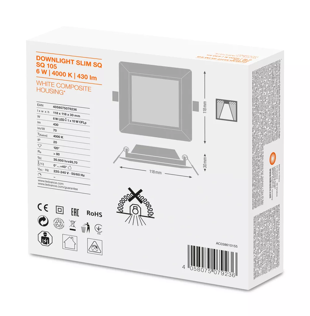 Płaskie oprawy oświetleniowe typu Downlight ze zintegrowanym zasilaczem, o kwadratowym kształcie. Cechy produktu: Wąska widzialna ramka. Puszka podłączeniowa z wciskanymi terminalami podłączeniowymi niewymagającymi narzędzi. Reflektor wykonany z nieżółknącego PMMA o długiej trwałości. Zalety produktu: Bardzo wąska obudowa. Mała głębokość montażu. Wysoka skuteczność świetlna. Energooszczędność do 60% (w porównaniu z oprawami oświetleniowymi wyposażonymi w świetlówki). Bardzo jednorodne światło. Funkcjonalne wzornictwo. Łatwa instalacja przy pomocy szybkozłącza. Prosta instalacja dzięki zintegrowanemu sterownikowi. Obszary zastosowań: Bezpośredni zamiennik opraw oświetleniowych do świetlówek kompaktowych. Oświetlenie ogólne. Strefy publiczne. Schody. Korytarze. Hole. Sklepy. Wyposażenie / Akcesoria: Ramy do montażu powierzchniowego dostępne jako wyposażenie dodatkowe. Porady dotyczące bezpieczeństwa: Wszystkie podłączenia elektryczne muszą być wykonane przez osobę wykwalifikowaną.. Uwaga, ryzyko porażenia prądem.. Oprawy nie nadają się do pokrywania materiałem termoizolacyjnym..