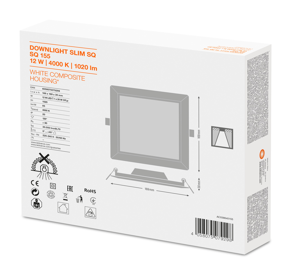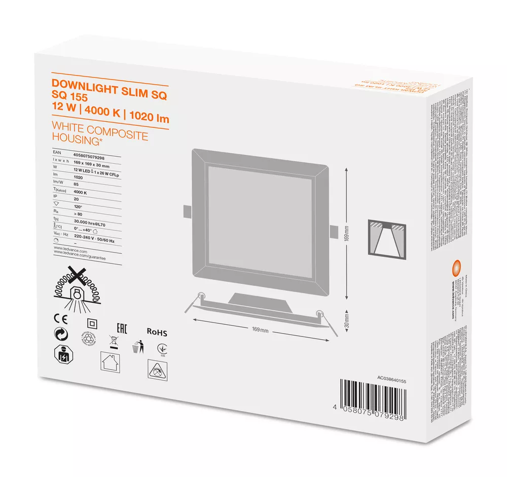 Płaskie oprawy oświetleniowe typu Downlight ze zintegrowanym zasilaczem, o kwadratowym kształcie. Cechy produktu: Wąska widzialna ramka. Puszka podłączeniowa z wciskanymi terminalami podłączeniowymi niewymagającymi narzędzi. Reflektor wykonany z nieżółknącego PMMA o długiej trwałości. Zalety produktu: Bardzo wąska obudowa. Mała głębokość montażu. Wysoka skuteczność świetlna. Energooszczędność do 60% (w porównaniu z oprawami oświetleniowymi wyposażonymi w świetlówki). Bardzo jednorodne światło. Funkcjonalne wzornictwo. Łatwa instalacja przy pomocy szybkozłącza. Prosta instalacja dzięki zintegrowanemu sterownikowi. Obszary zastosowań: Bezpośredni zamiennik opraw oświetleniowych do świetlówek kompaktowych. Oświetlenie ogólne. Strefy publiczne. Schody. Korytarze. Hole. Sklepy. Wyposażenie / Akcesoria: Ramy do montażu powierzchniowego dostępne jako wyposażenie dodatkowe. Porady dotyczące bezpieczeństwa: Wszystkie podłączenia elektryczne muszą być wykonane przez osobę wykwalifikowaną.. Uwaga, ryzyko porażenia prądem.. Oprawy nie nadają się do pokrywania materiałem termoizolacyjnym..