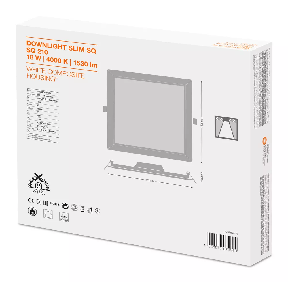 Płaskie oprawy oświetleniowe typu Downlight ze zintegrowanym zasilaczem, o kwadratowym kształcie. Cechy produktu: Wąska widzialna ramka. Puszka podłączeniowa z wciskanymi terminalami podłączeniowymi niewymagającymi narzędzi. Reflektor wykonany z nieżółknącego PMMA o długiej trwałości. Zalety produktu: Bardzo wąska obudowa. Mała głębokość montażu. Wysoka skuteczność świetlna. Energooszczędność do 60% (w porównaniu z oprawami oświetleniowymi wyposażonymi w świetlówki). Bardzo jednorodne światło. Funkcjonalne wzornictwo. Łatwa instalacja przy pomocy szybkozłącza. Prosta instalacja dzięki zintegrowanemu sterownikowi. Obszary zastosowań: Bezpośredni zamiennik opraw oświetleniowych do świetlówek kompaktowych. Oświetlenie ogólne. Strefy publiczne. Schody. Korytarze. Hole. Sklepy. Wyposażenie / Akcesoria: Ramy do montażu powierzchniowego dostępne jako wyposażenie dodatkowe. Porady dotyczące bezpieczeństwa: Wszystkie podłączenia elektryczne muszą być wykonane przez osobę wykwalifikowaną.. Uwaga, ryzyko porażenia prądem.. Oprawy nie nadają się do pokrywania materiałem termoizolacyjnym..