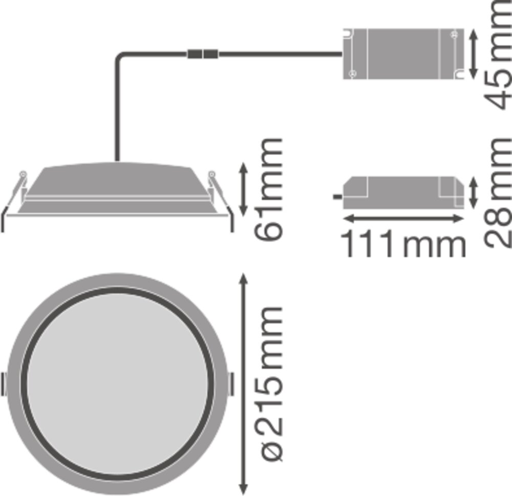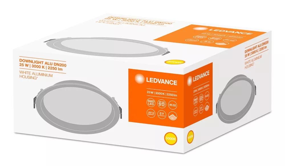 Oprawy oświetleniowe typu Downlight z obudowami z aluminium. Cechy produktu: Średnica wymaganego otworu w suficie: 150 mm lub 200 mm (w zależności od wersji). Stopień ochrony: IP44. Zalety produktu: Wysoka skuteczność świetlna. Energooszczędność do 60% (w porównaniu z oprawami oświetleniowymi wyposażonymi w świetlówki). Bardzo jednorodne światło. Funkcjonalne wzornictwo. Łatwa instalacja przy pomocy szybkozłącza. Zewnętrzny zasilacz zwiększa uniwersalność (kompatybilność z wybranymi zasilaczami DALI). 5-letnia gwarancja. Obszary zastosowań: Bezpośredni zamiennik opraw oświetleniowych do świetlówek kompaktowych. Oświetlenie ogólne. Strefy publiczne. Schody. Korytarze. Hole. Sklepy. Porady dotyczące bezpieczeństwa: Wszystkie podłączenia elektryczne muszą być wykonane przez osobę wykwalifikowaną.. Uwaga, ryzyko porażenia prądem.. Oprawy nie nadają się do pokrywania materiałem termoizolacyjnym..