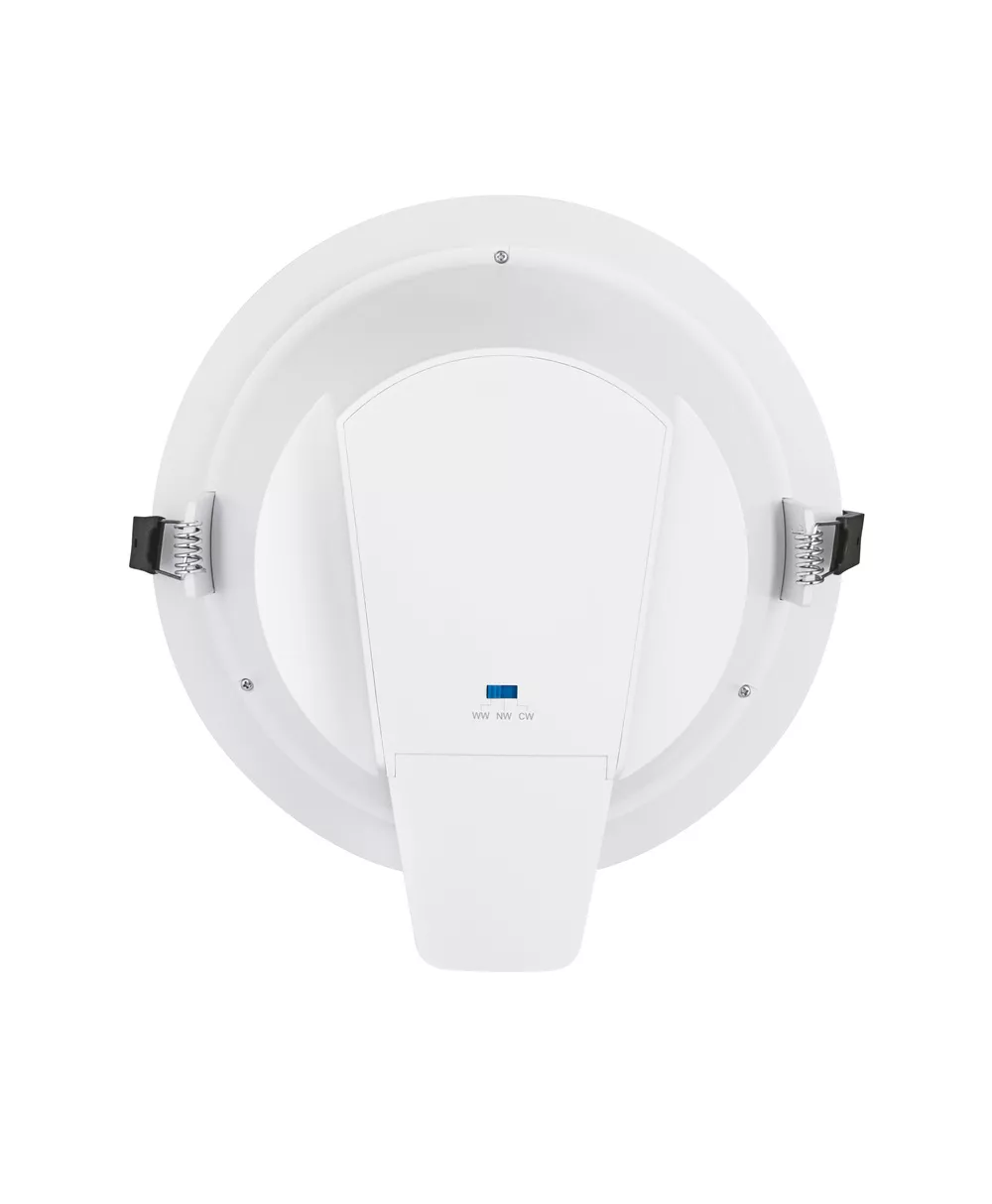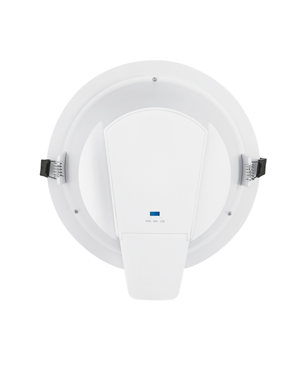 Oprawy typu Downlight z regulacją światła białego. Cechy produktu: Możliwość wyboru 3 barw światła za pomocą przełącznika suwakowego. Stopień ochrony: IP54. Puszka podłączeniowa z wciskanymi terminalami podłączeniowymi niewymagającymi narzędzi. Możliwe okablowanie przelotowe. Zalety produktu: Prosta instalacja dzięki zintegrowanemu sterownikowi. Łatwa instalacja przy pomocy szybkozłącza. 5-letnia gwarancja. Obszary zastosowań: Bezpośredni zamiennik opraw oświetleniowych do świetlówek kompaktowych. Oświetlenie ogólne. Łazienki. Kuchnie. Biura. Korytarze. Hole. Sklepy. Schody. Porady dotyczące bezpieczeństwa: Wszystkie podłączenia elektryczne muszą być wykonane przez osobę wykwalifikowaną.. Uwaga, ryzyko porażenia prądem.. Oprawy nie nadają się do pokrywania materiałem termoizolacyjnym.. Produkt w klasie ochrony I. Wszystkie przewodzące prąd, metalowe części obudowy, które mogą absorbować napięcie podczas pracy lub podczas konserwacji w przypadku awarii, muszą być stale PODŁĄCZONE do przewodu uziemiającego..