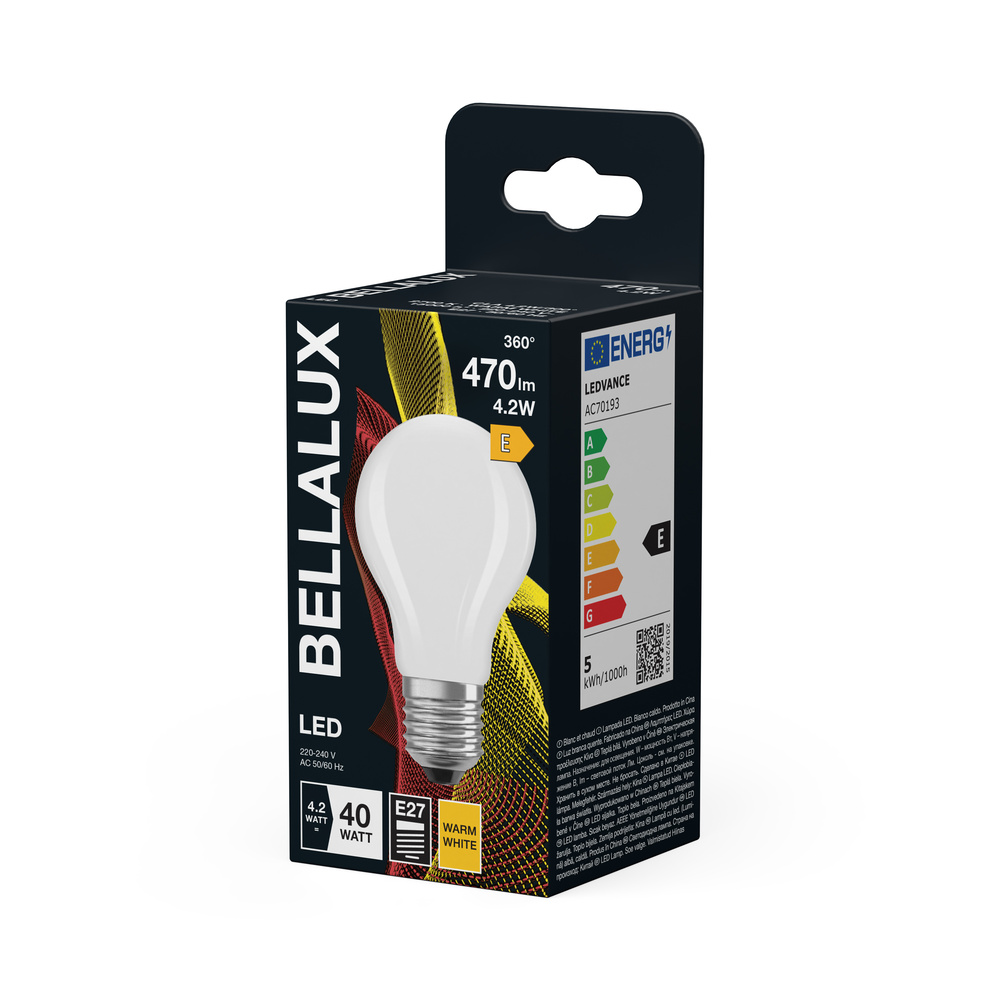 Lampy LED, klasyczny kształt żarówki. Cechy produktu: Lampy LED dla napięcia sieciowego. Brak możliwości regulacji strumienia świetlnego. Lampy niezawierające rtęci. Zalety produktu: Niższe zużycie energii w porównaniu do lamp żarowych lub halogenowych. Odporność na wstrząsy i drgania dzięki technologii LED. Brak promieniowania UV w wiązce światła. Natychmiast 100 % światła, bez czasu nagrzewania. Łatwy montaż zamiast zwykłych żarówek. Niskie obciążenie cieplne (w porównaniu ze standardowym produktem referencyjnym). Obszary zastosowań: Zastosowania domowe. Oświetlenie ogólne. Eksploatacja na zewnątrz wyłącznie w oprawach zewnętrznych (co najmniej IP65). Porady dotyczące bezpieczeństwa: Nie dotykaj lampy, jeśli jest stłuczona.. Nie wolno używać, jeśli zewnętrzne źródło światła jest uszkodzone..